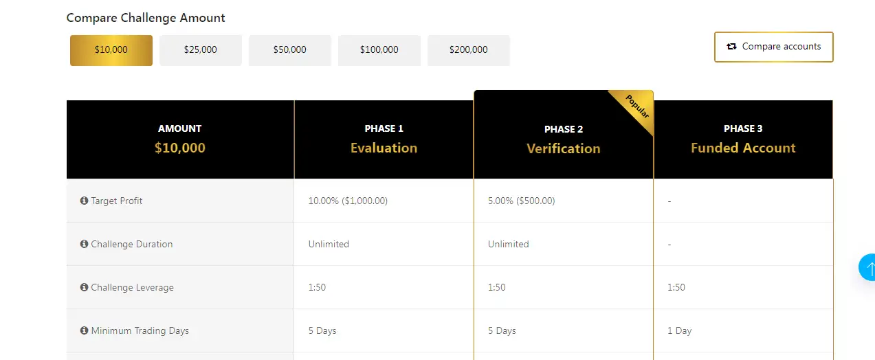 - خطة بقيمة 10,000 دولار أمريكي: تشمل هذه الخطة مرحلتين يجب اجتيازهما. في المرحلة الأولى، يتعين تحقيق ربح بنسبة 10% من إجمالي الرصيد، وفي المرحلة الثانية يجب تحقيق ربح إضافي بنسبة 5%. مدة التحدي غير محددة، مع رفع مالي بنسبة 1:50. الحد الأقصى للخسارة المسموح بها هو 10% من الرصيد، والخسارة اليومية القصوى 5%. يتم تقاسم الأرباح بنسبة 80% للعميل و20% للشركة. تبلغ رسوم الاسترداد في المرحلة الأولى 100 دولار أمريكي.